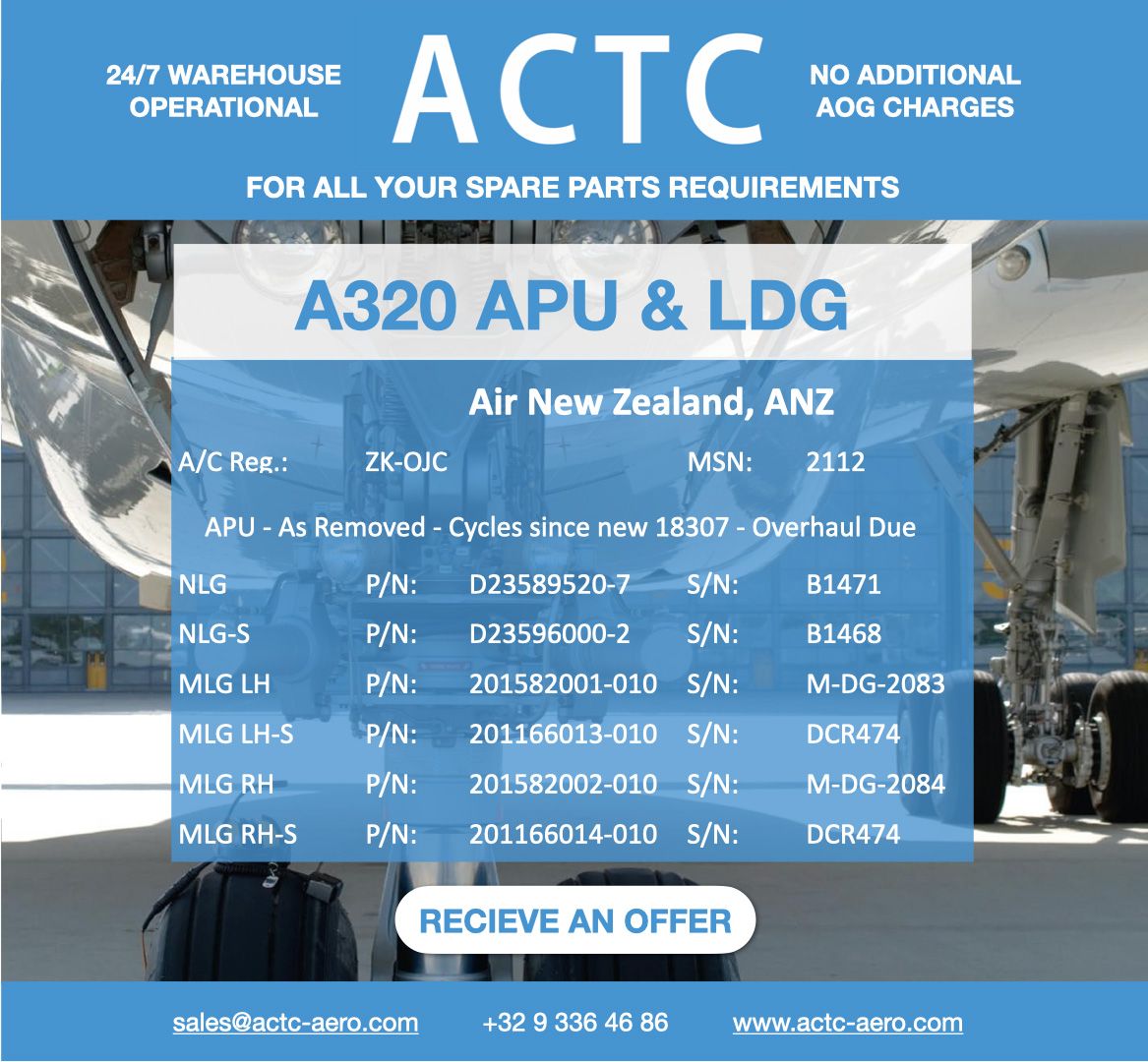 ACTC is specialized in the supply of aircraft spare parts and providing services to the Aviation industry. ACTC buy, sell, exchange, lease and distribute aircrafts spare parts globally. We provide consulting services in inventory management, with our core business in repair and purchasing managment, inventory replenishment, AOG service, warehousing and logistical services.